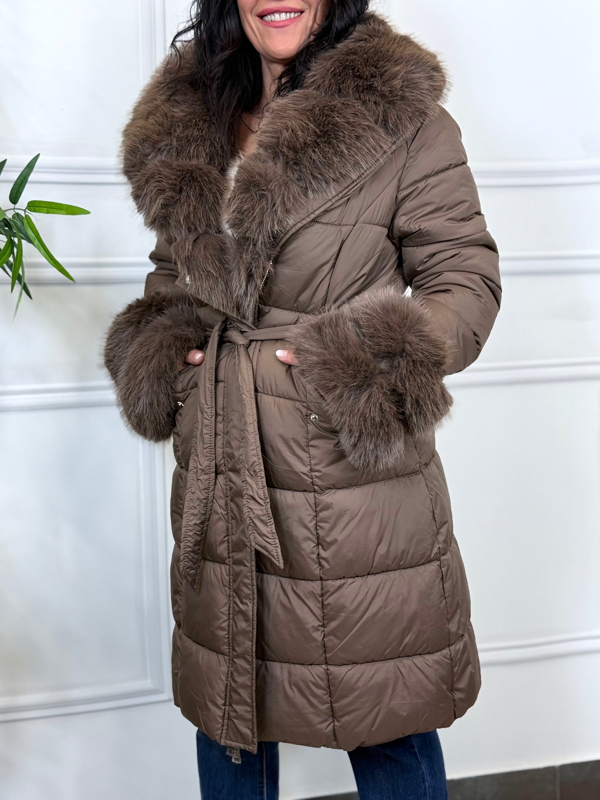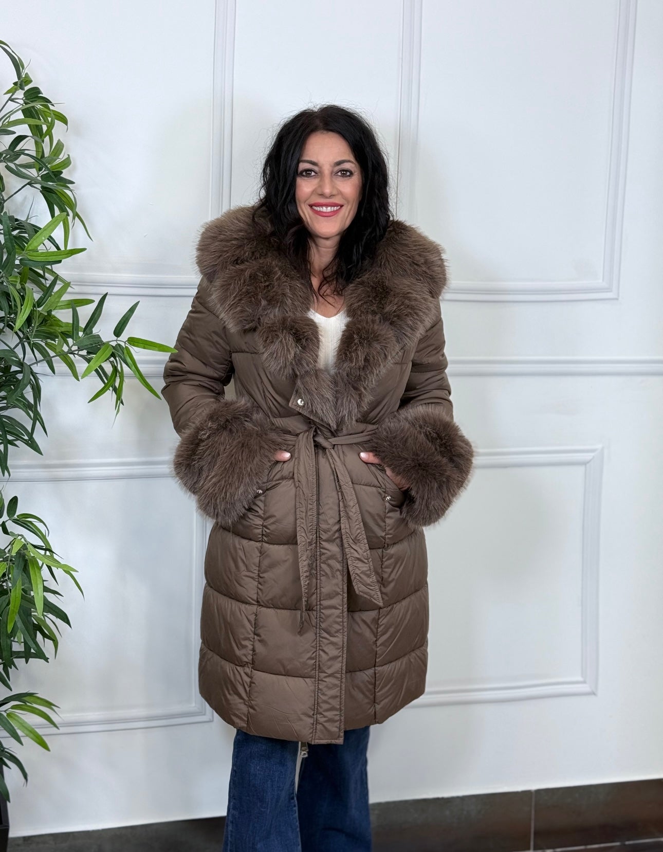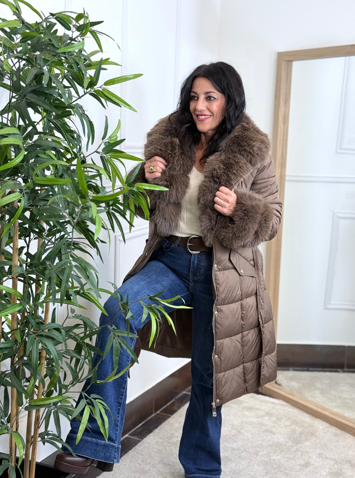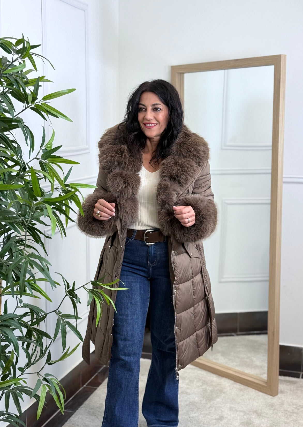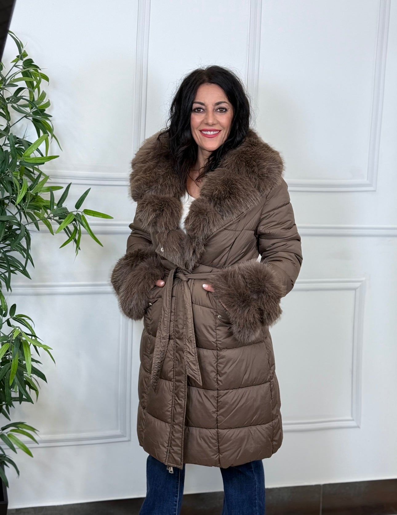 Cazadora acolchada con pelo desmontable en cuello y puños, cierre con cremallera y botones delanteros, bolsillos delanteros, forro interior.