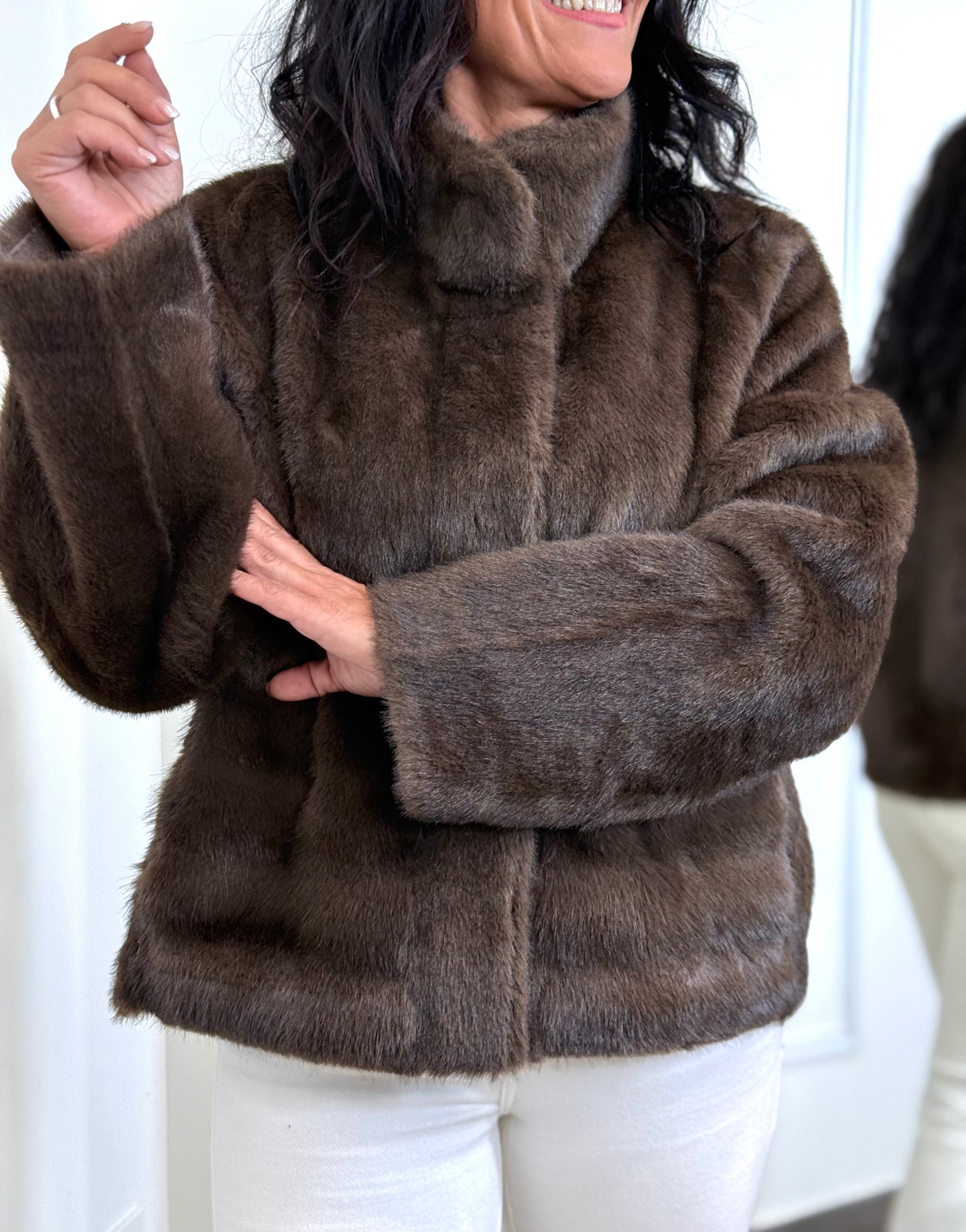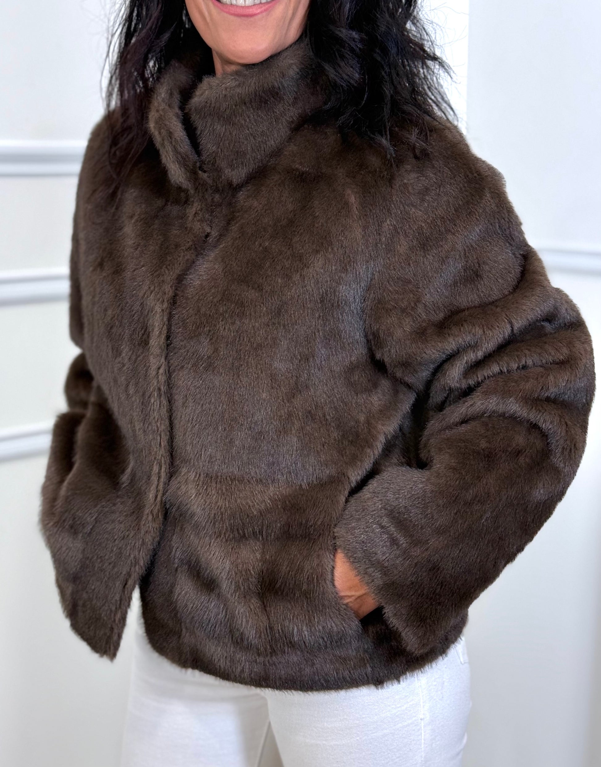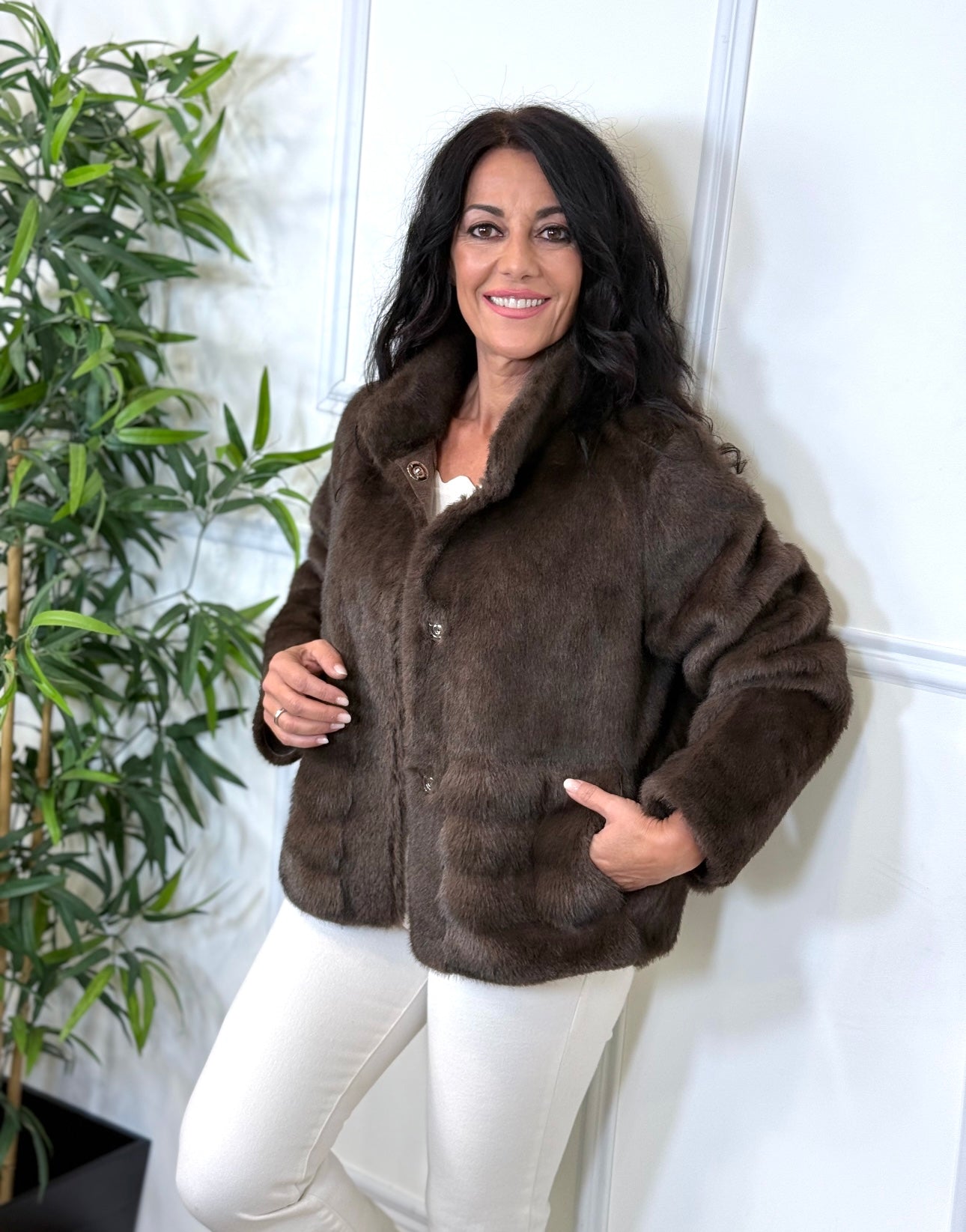 Abrigo de pelo marrón chocolate, cierre con botones de clip, bolsillos laterales y forro de doble faz.
