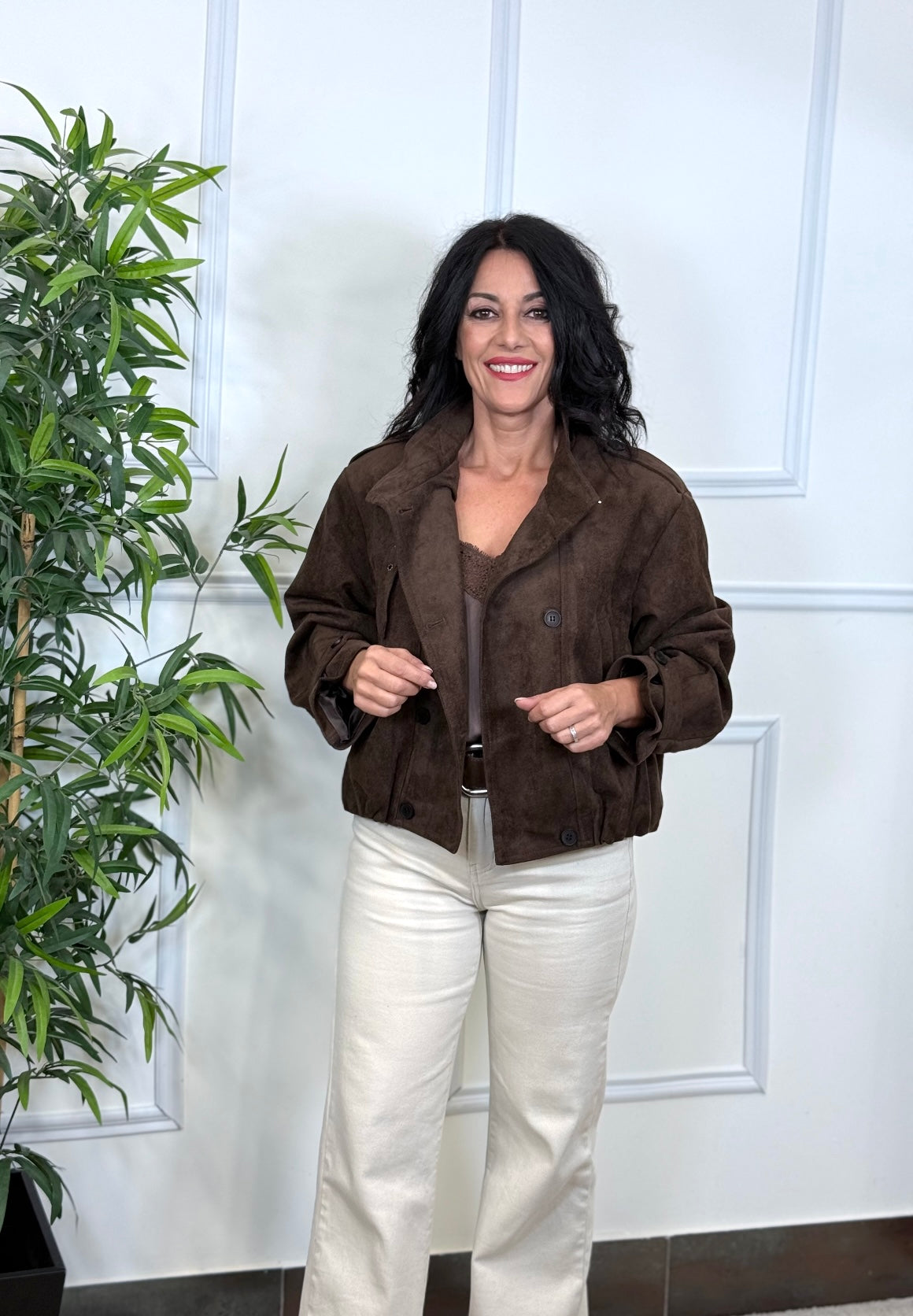 Bomber ante chocolate, corte oversize, cierre frontal con botones.Hombros con detalles.Engomado por la parte de la cintura-cadera. Bolsillos laterales y forro interior.