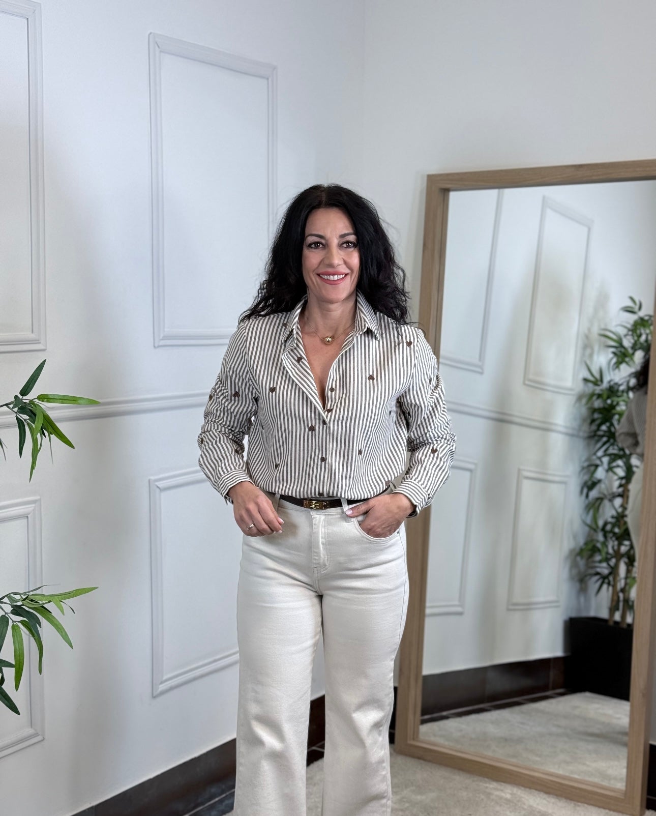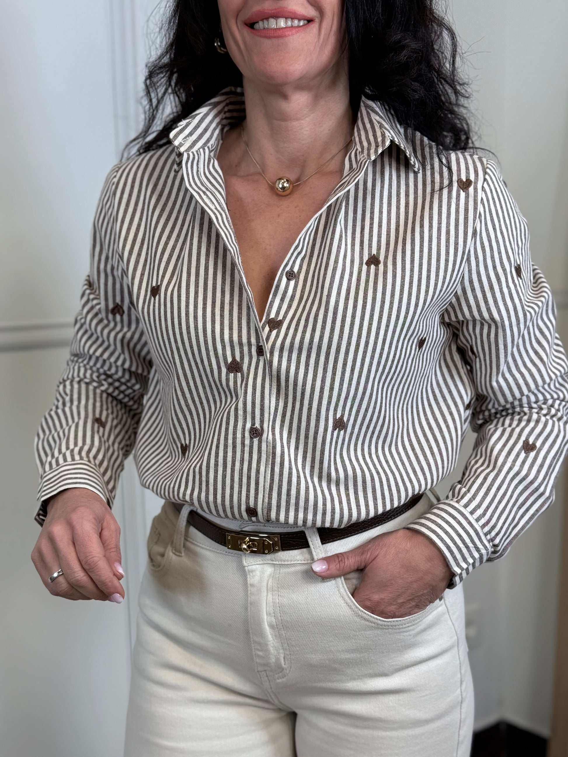 Camisa de raya, diplomática, marrón, chocolate y beis, con detalle de bordados por la parte delantera trasera y brazo de corazón en chocolate .
