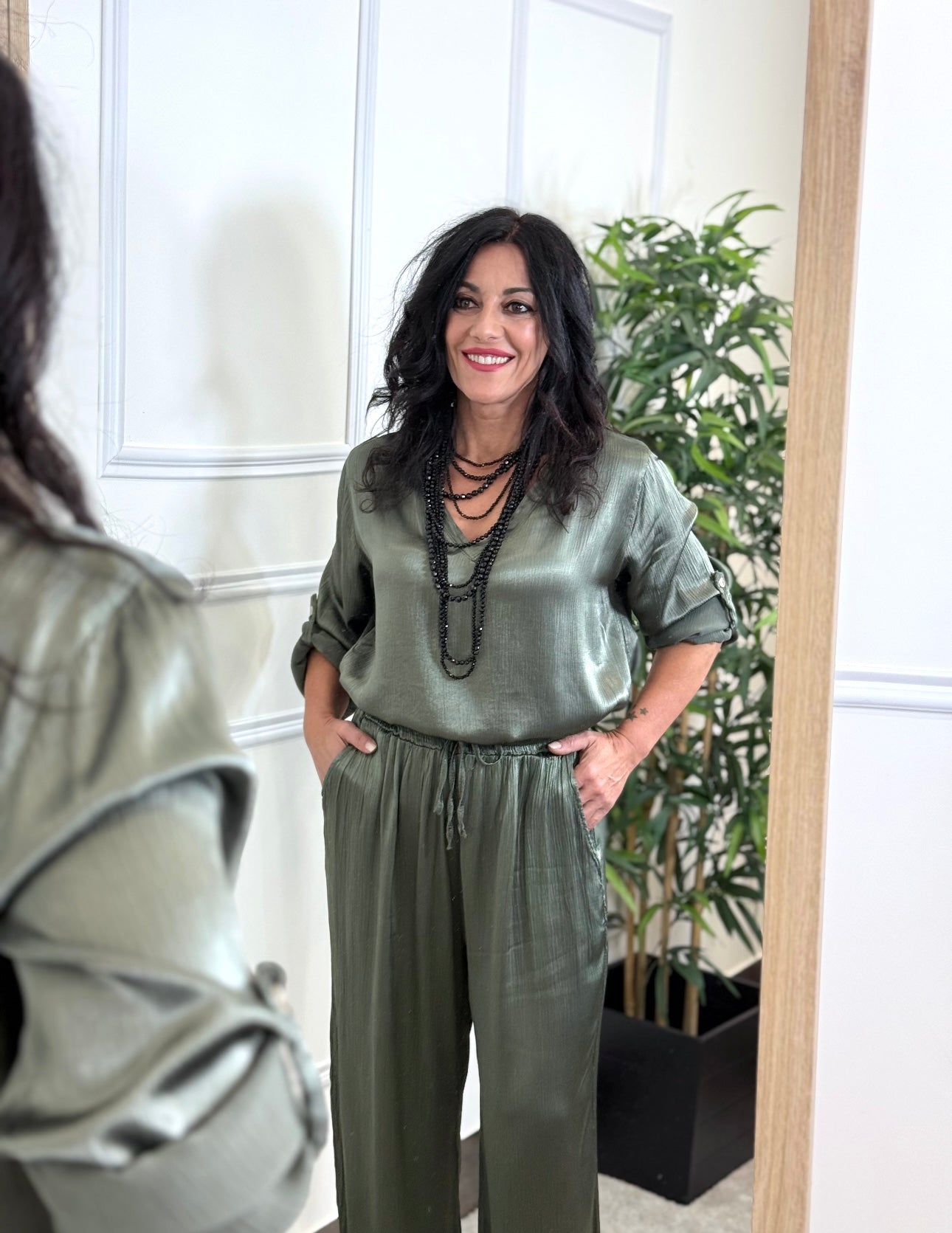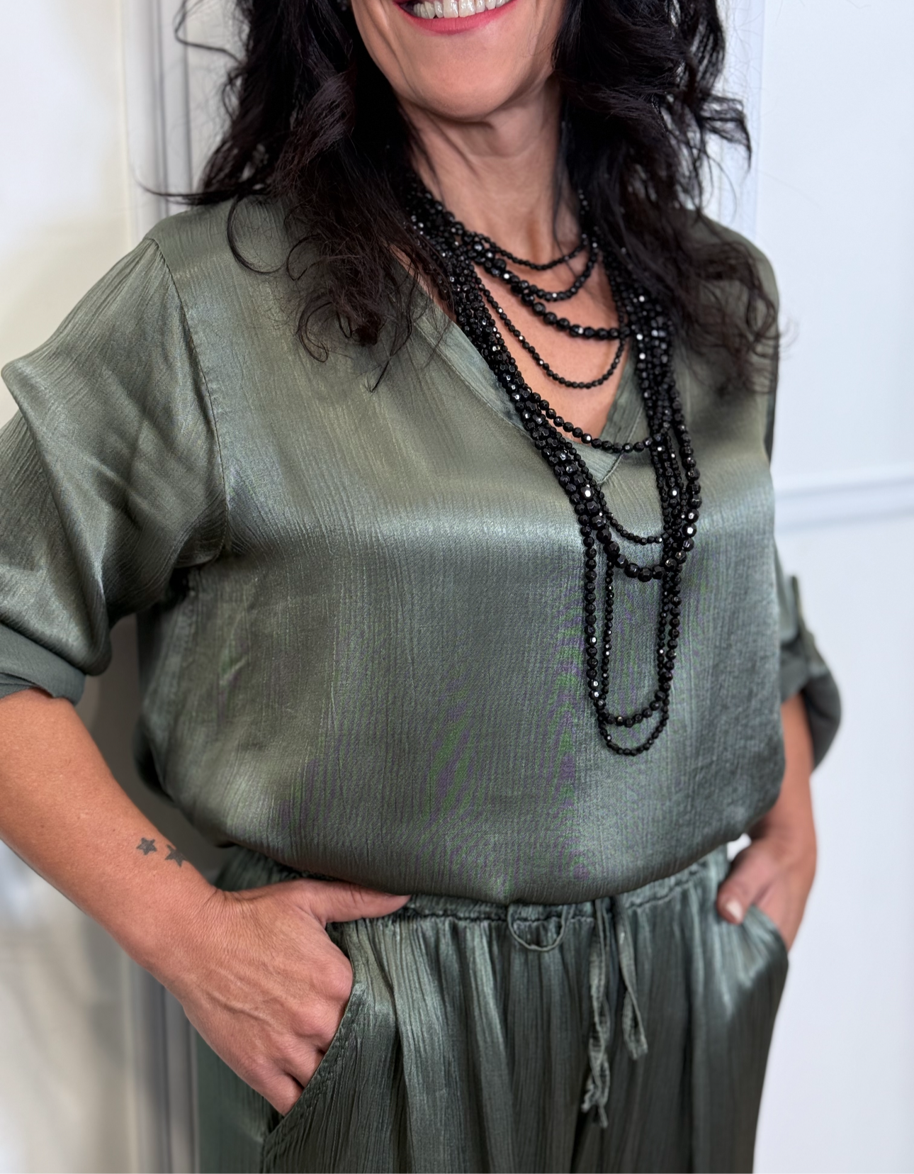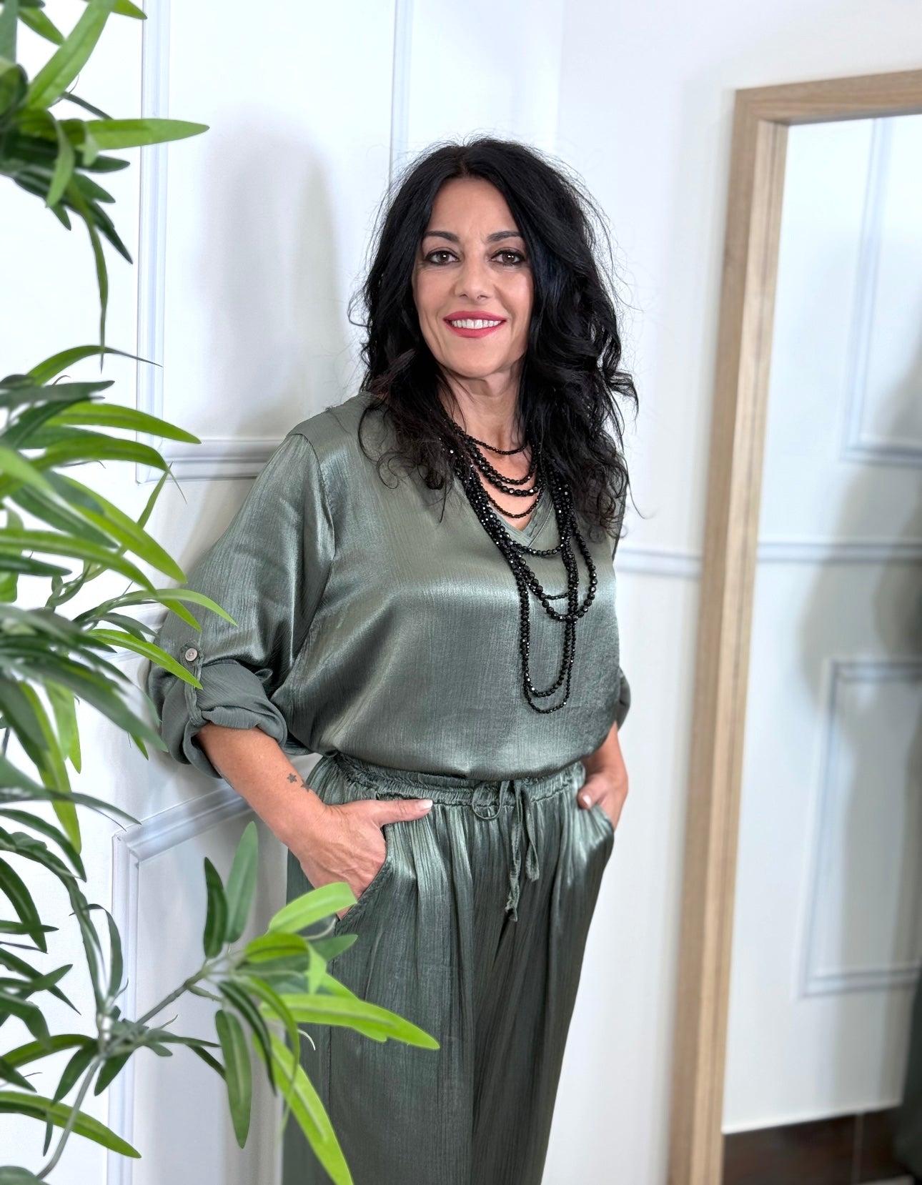 Blusa satinada escote en pico, detalle de manga recogida con botón.