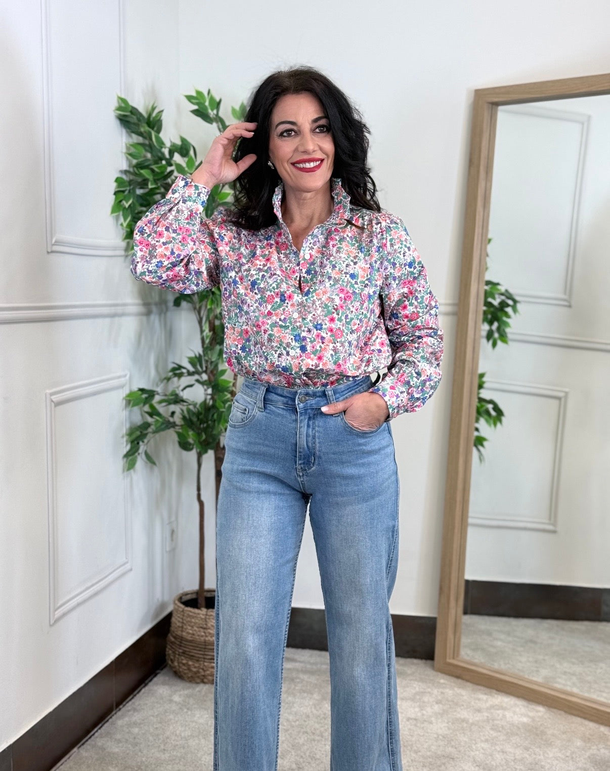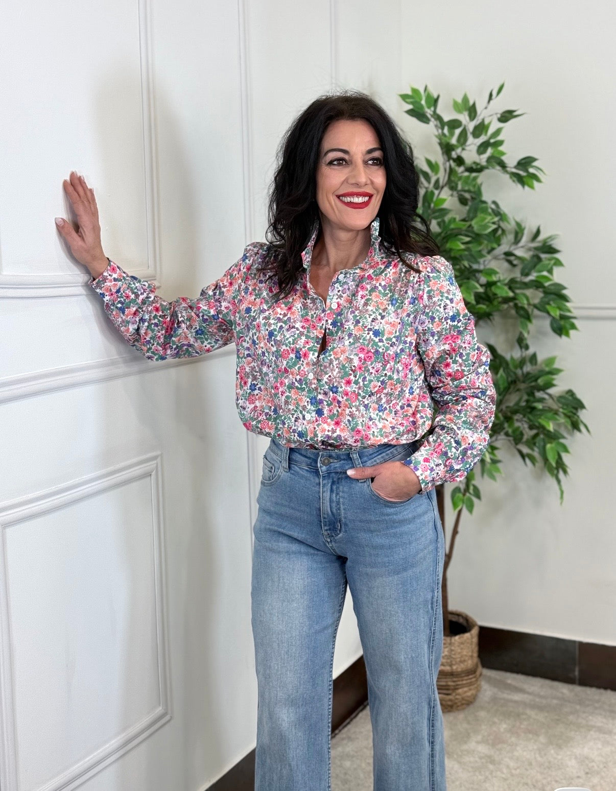 Camisas estampada de flores con colores, detalle de cuello Mao y cierre con botones.