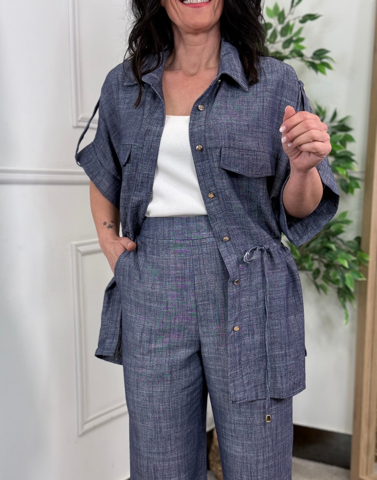 Camisa cierre con botones de talla de solapas, imitando bolsillos. Detalle de fruncido en cintura.