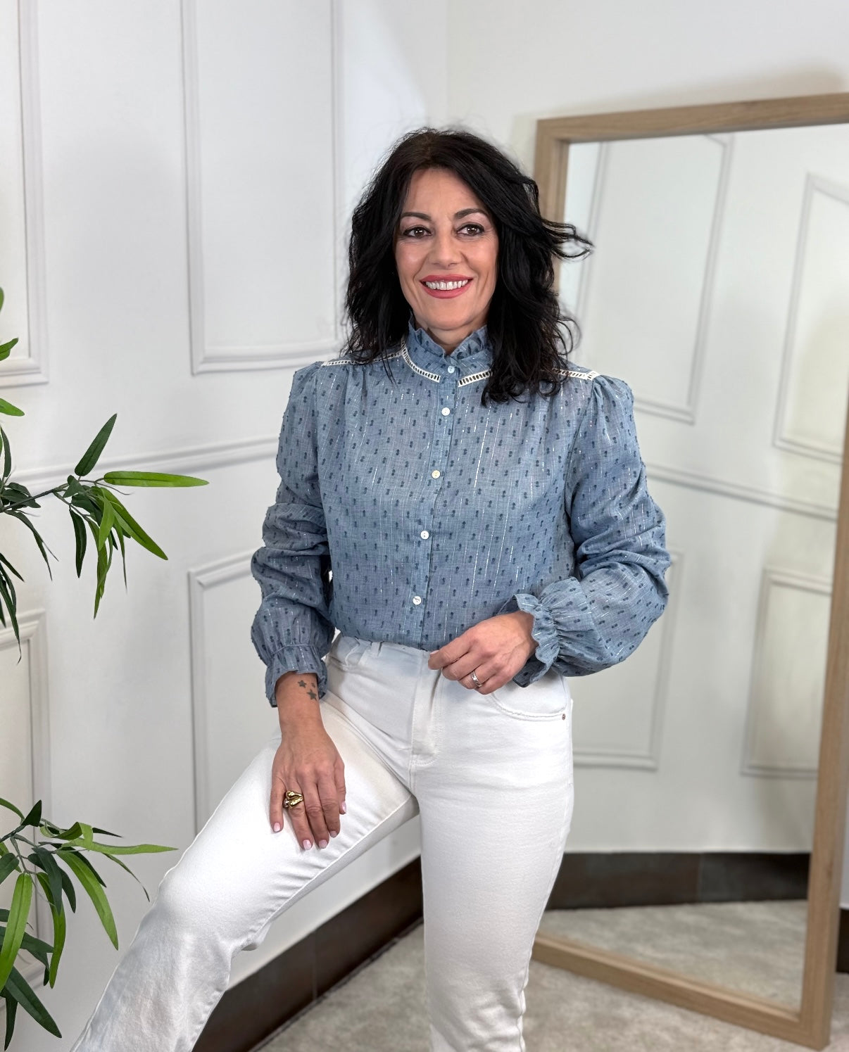 Camisa con detalle de bordados en el mismo tono y hilo fino en plateado, detalle de vainicas alrededor del cuello y en la zona del hombrera, cuello Mao y cierre con botones. Puño engomado