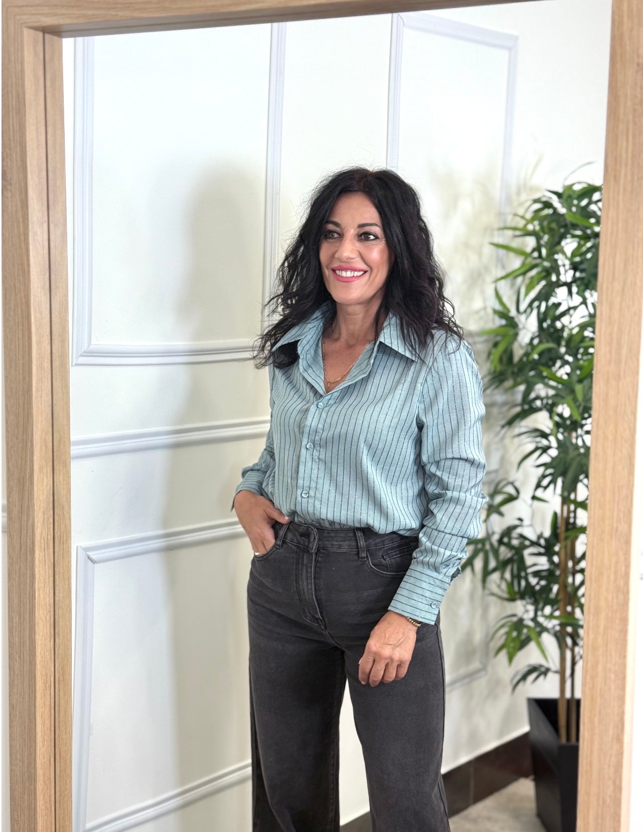 Camisa azul con raya diplomática en gris con detalle de brillo. Detalle en la espalda.