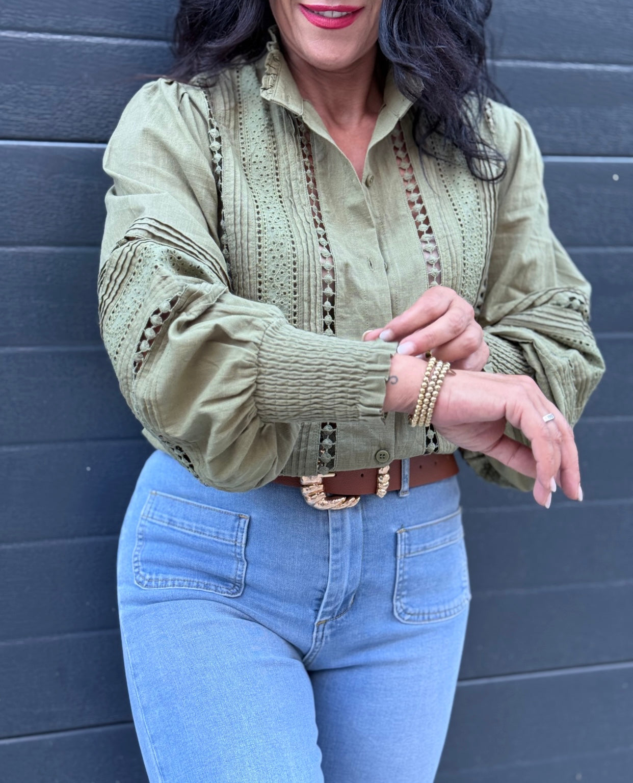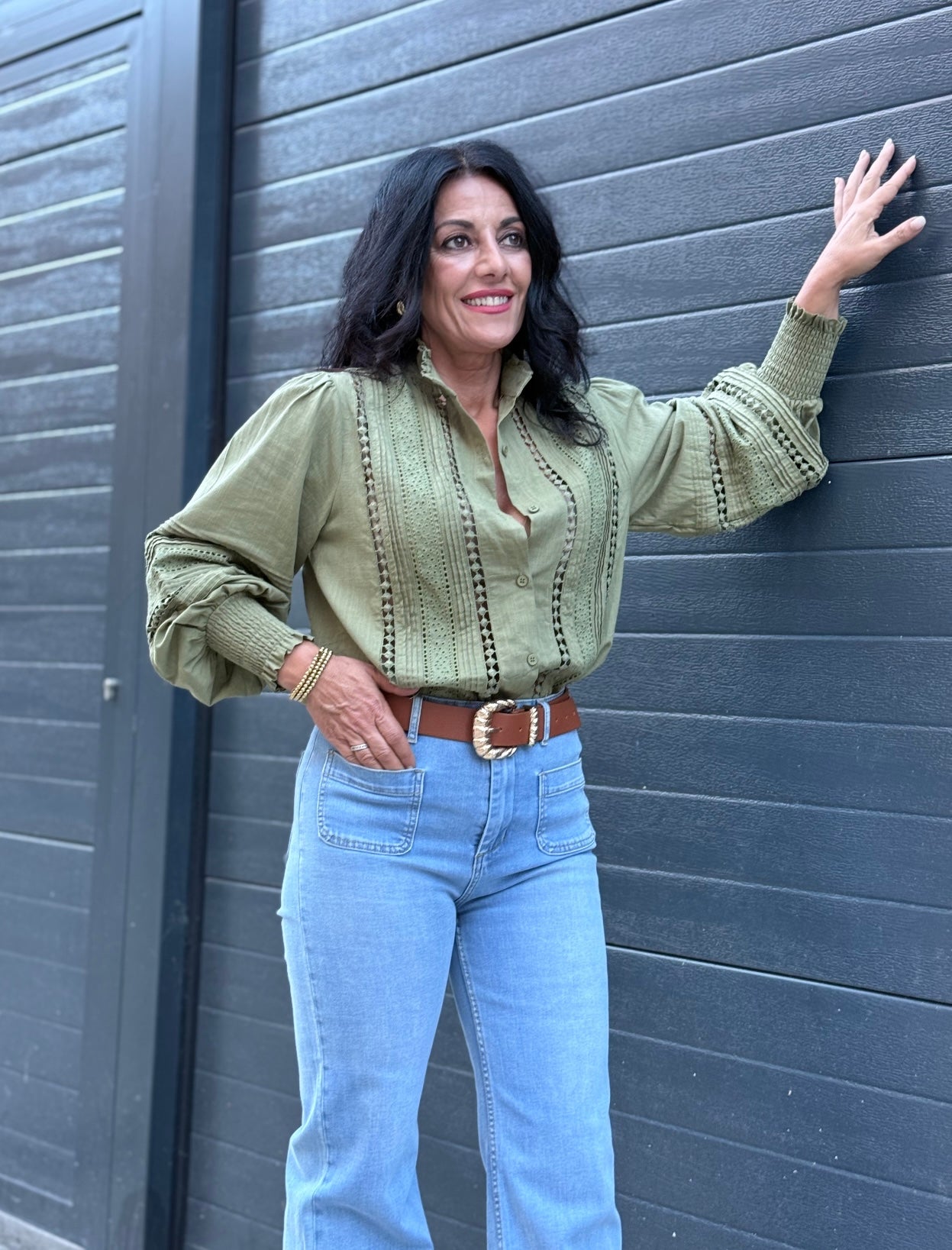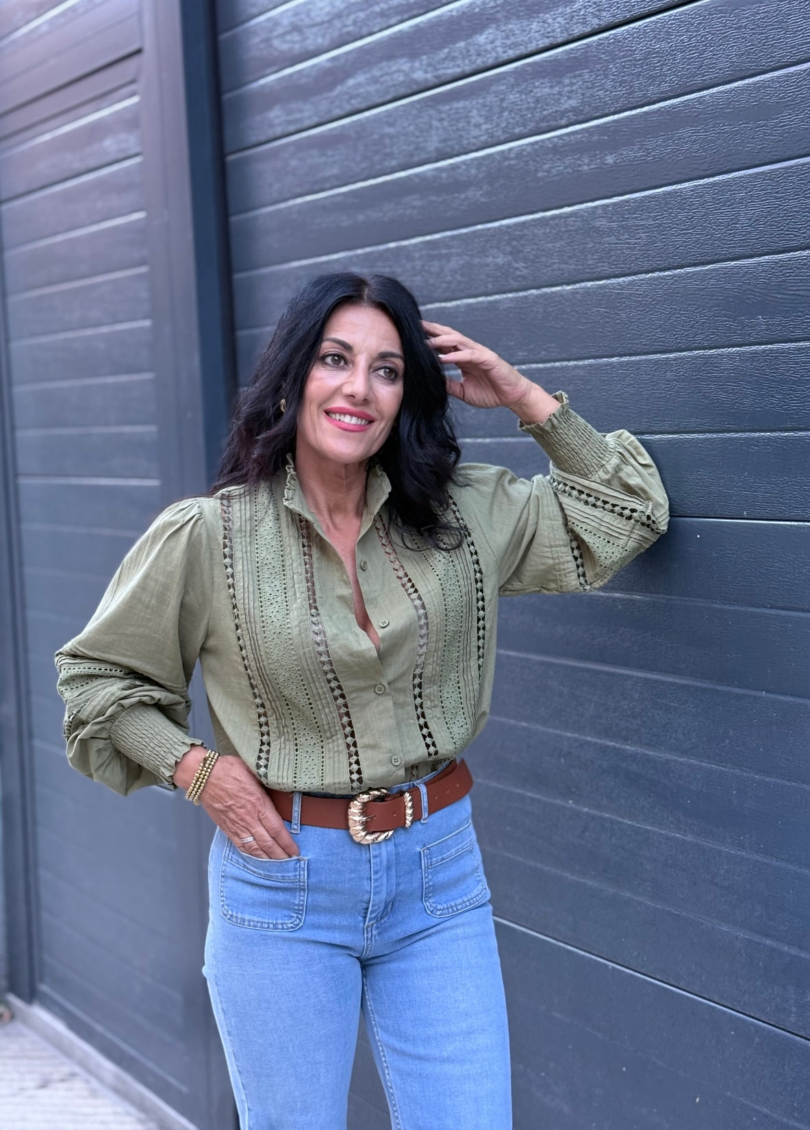 Camisa verde con detalles de encajes, cuello mao, cierre con botones delanteros y puño enconado finalizado en volante.