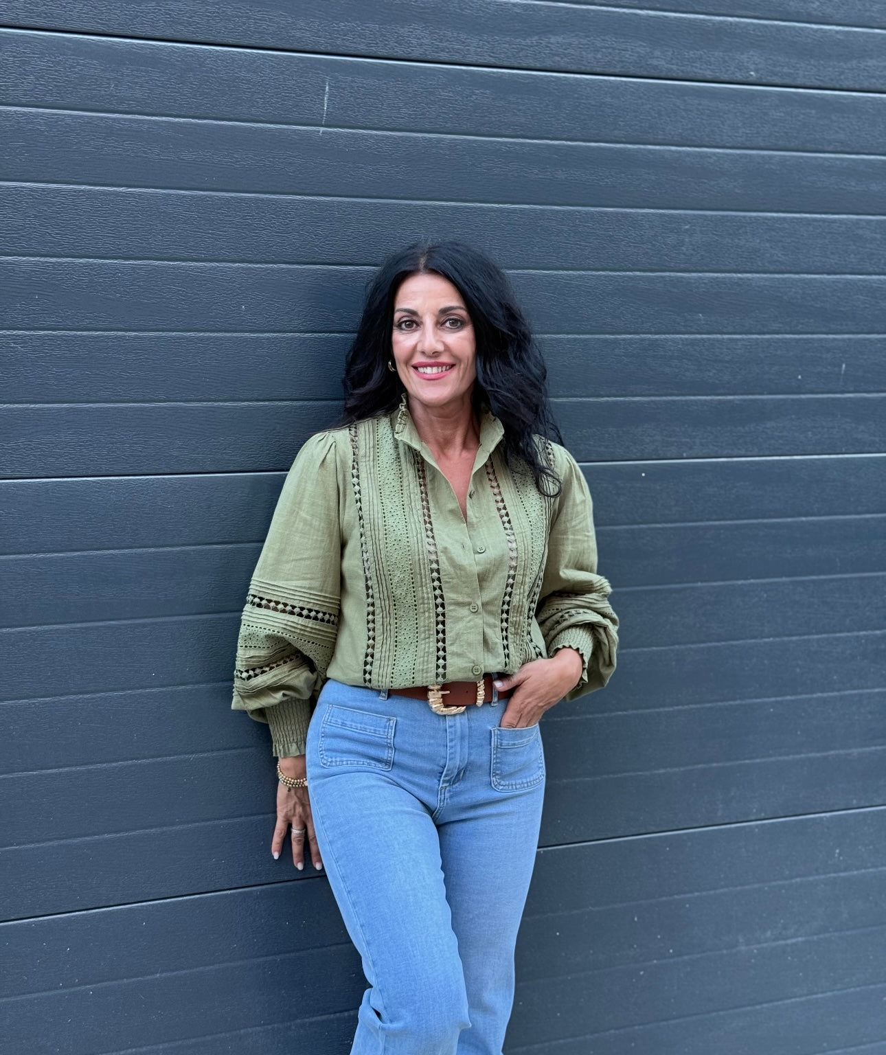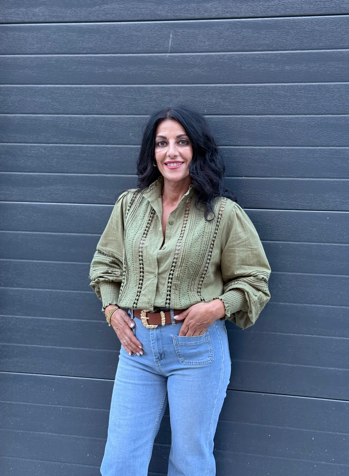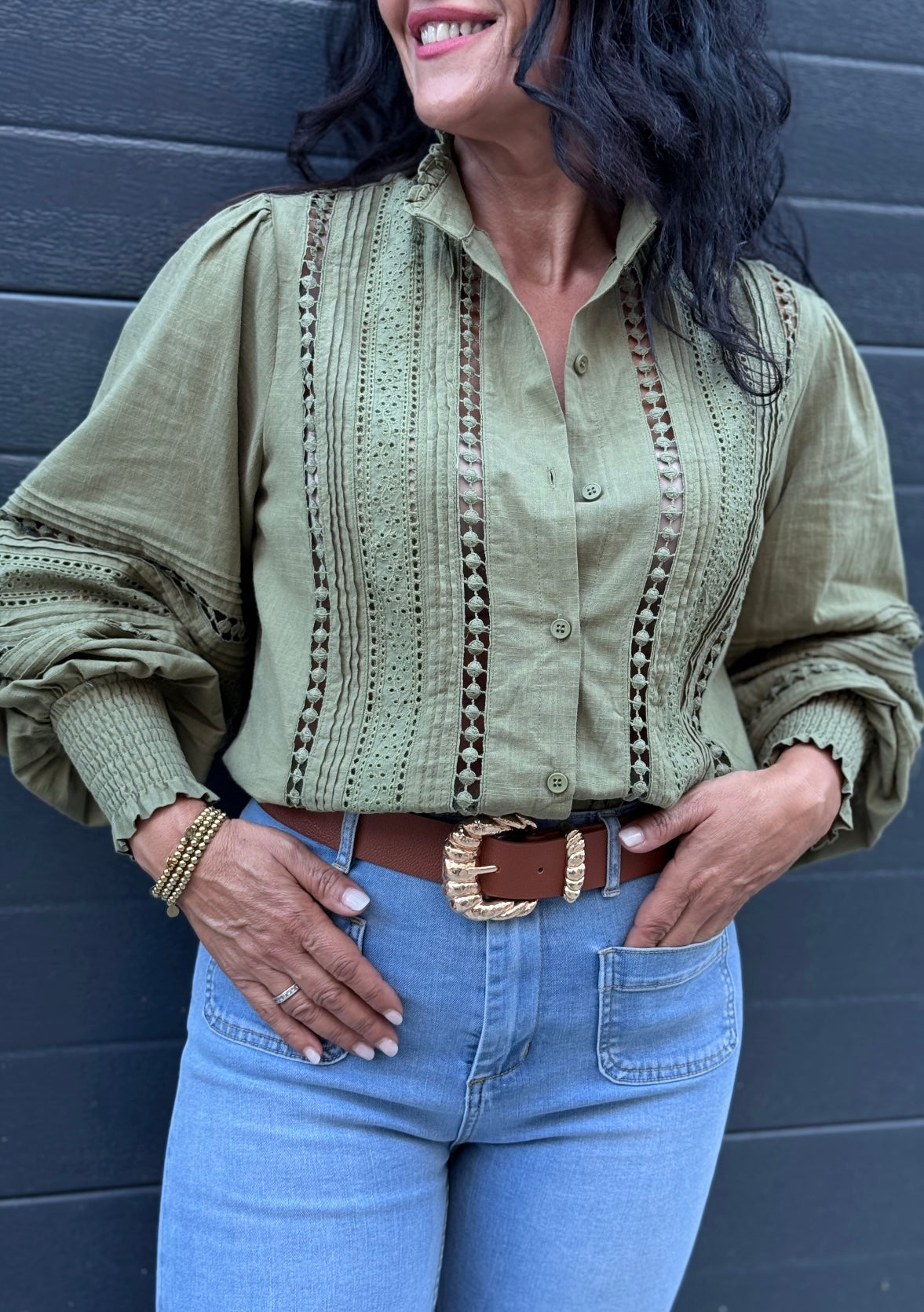 Camisa verde con detalles de encajes, cuello mao, cierre con botones delanteros y puño enconado finalizado en volante.