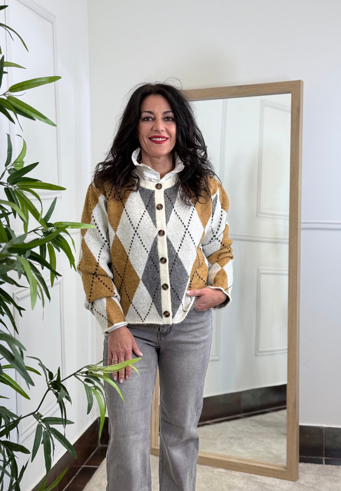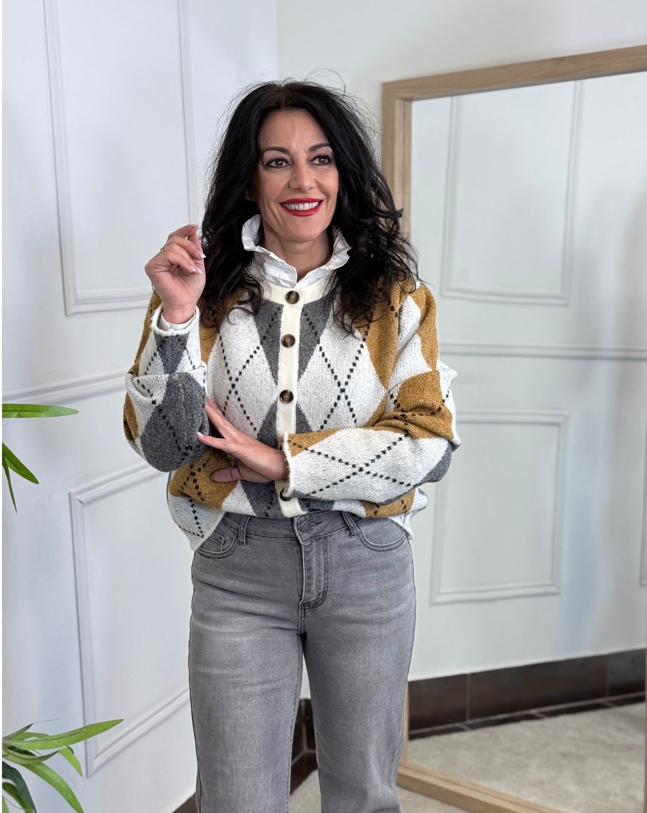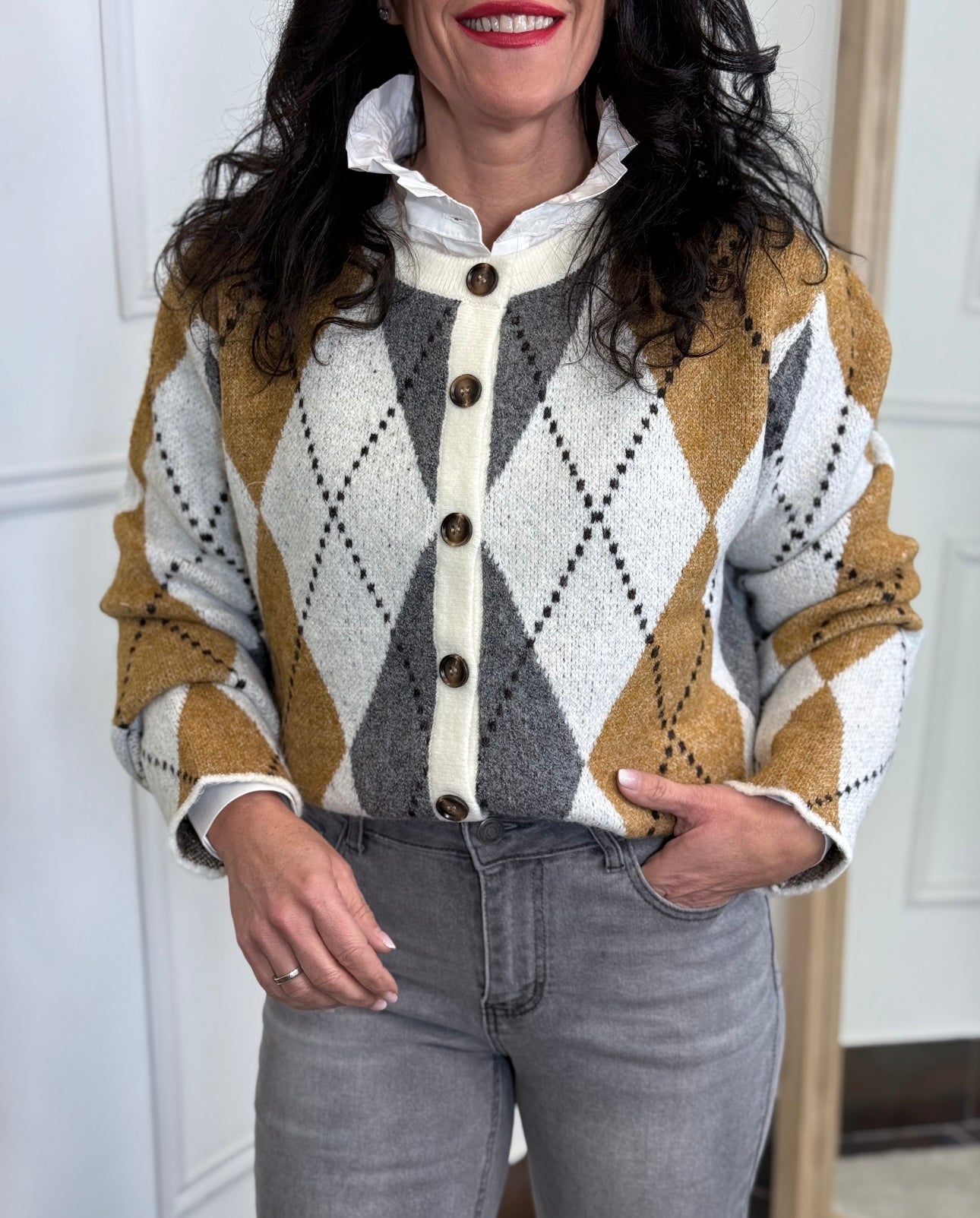 cardigan rombos en tonos mostaza, gris y beige . Cuello redondo, cierre con botones.