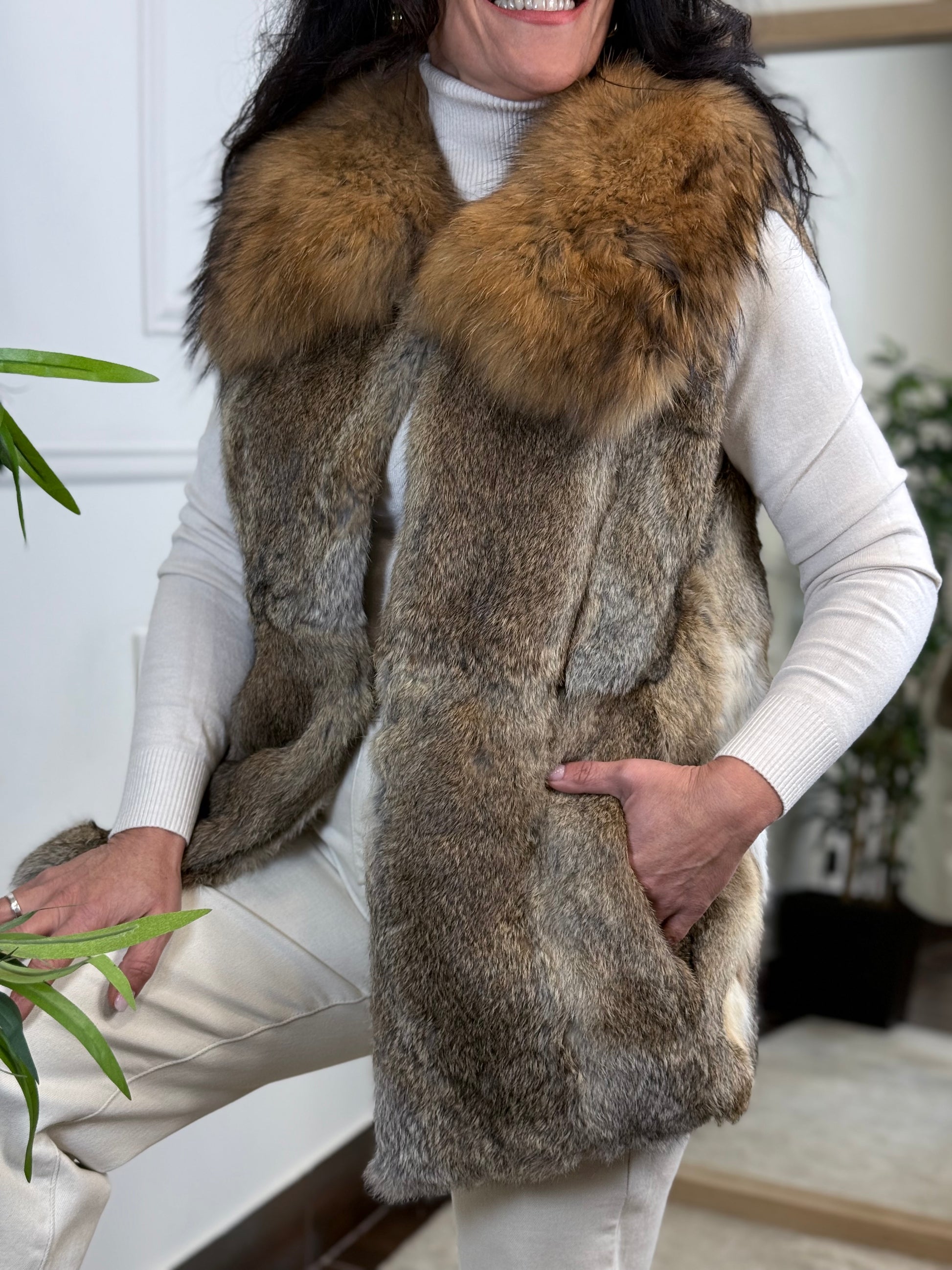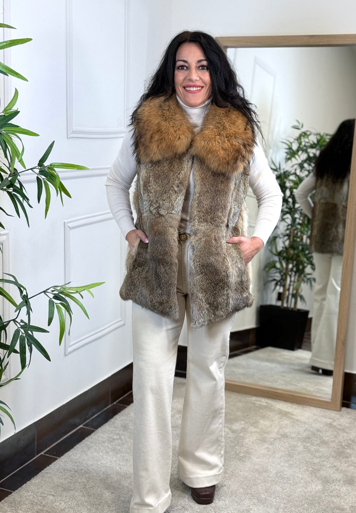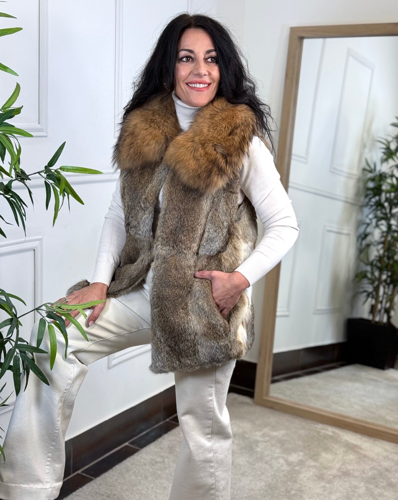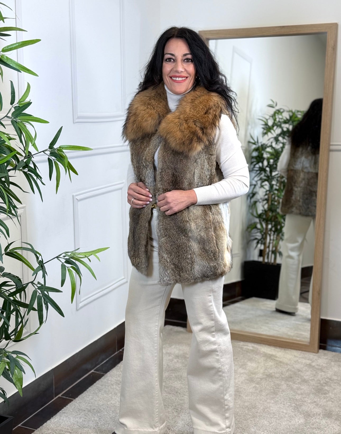 Chaleco pelo natural en tono Camel . Forro interior y bolsillos laterales