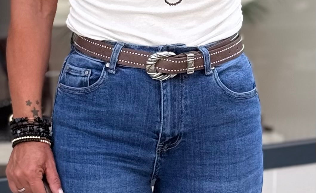 Cinturón detalle hebilla plateada y detalle de tachuelas.