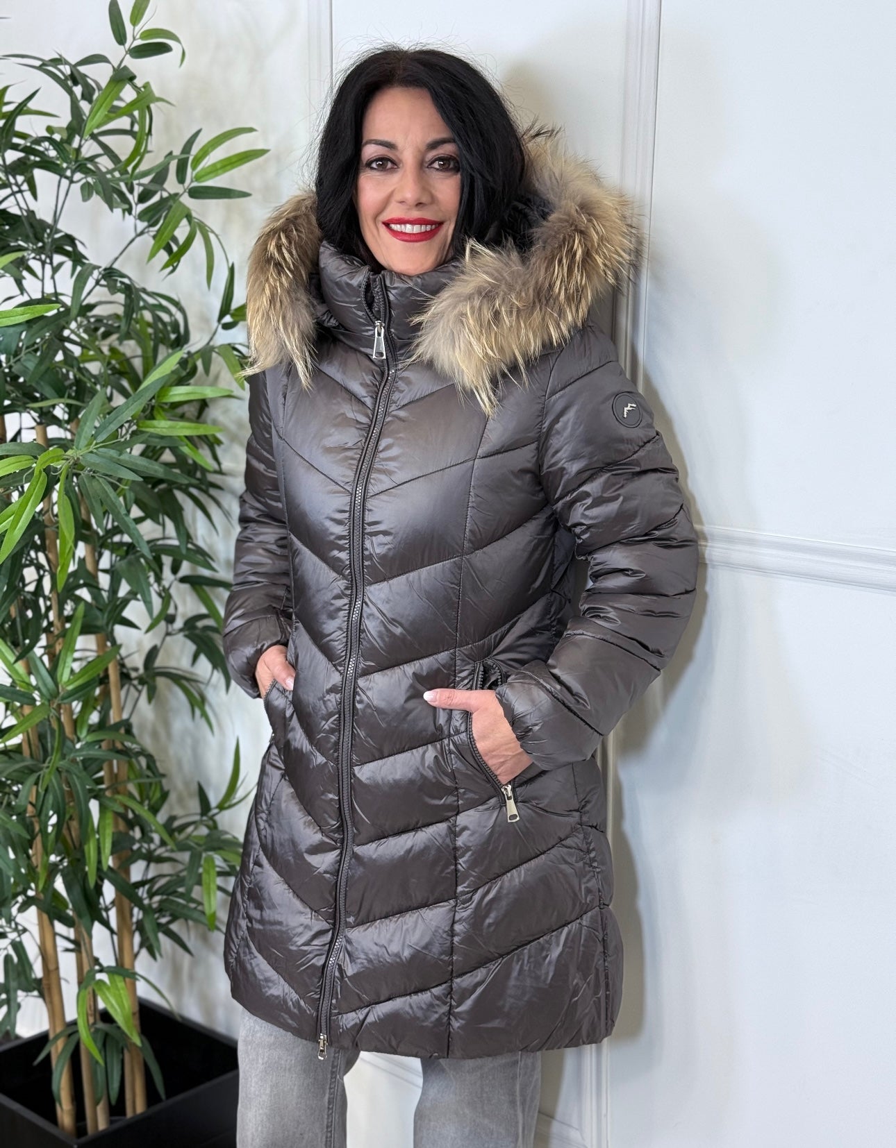 Abrigo color gris noche cierre con cremallera, detalle de bolsillos laterales. Capucha con pelo natural (se puede quitar). Si dudas entre tallas (la mayor)