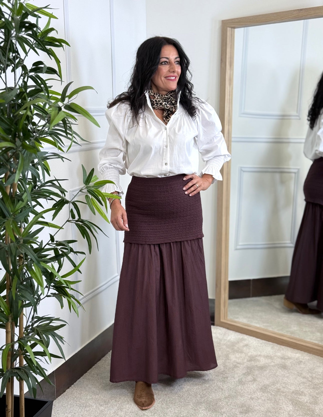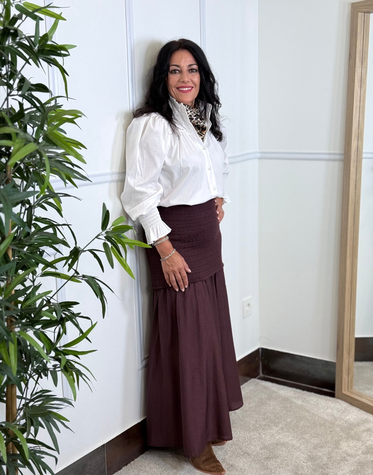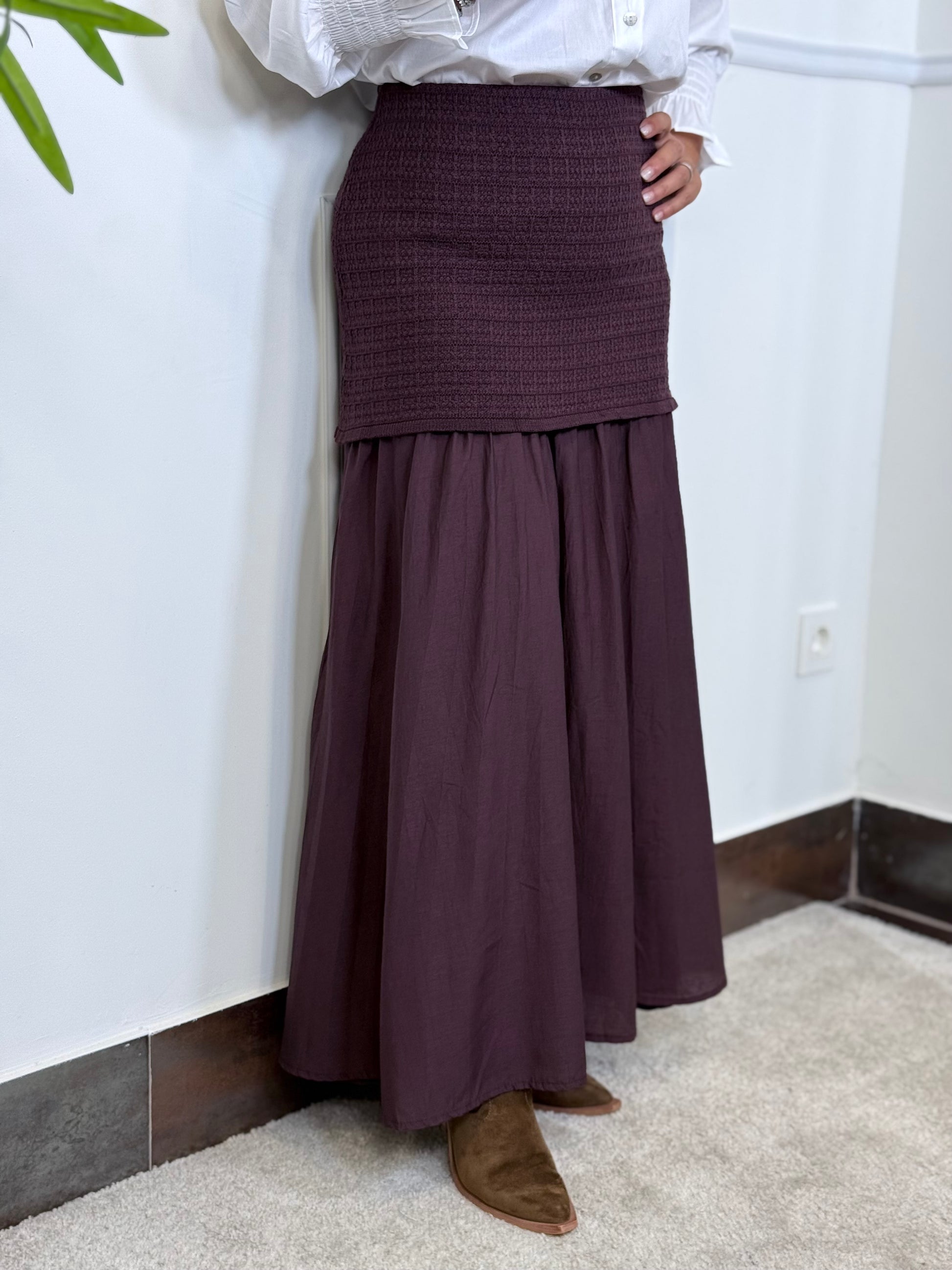 Falda larga entallada en punto de la cadera a la cintura, acabada en nylon.