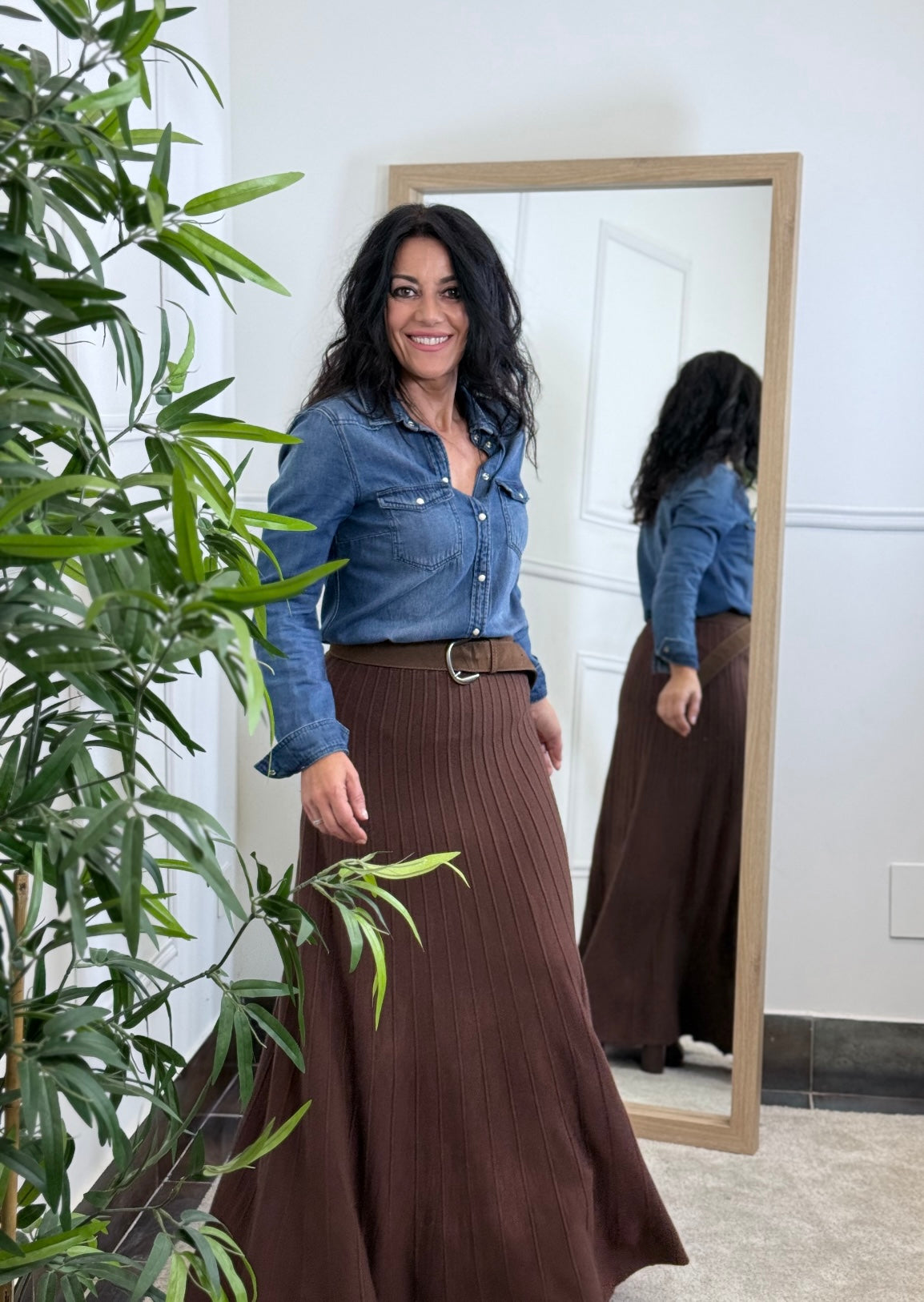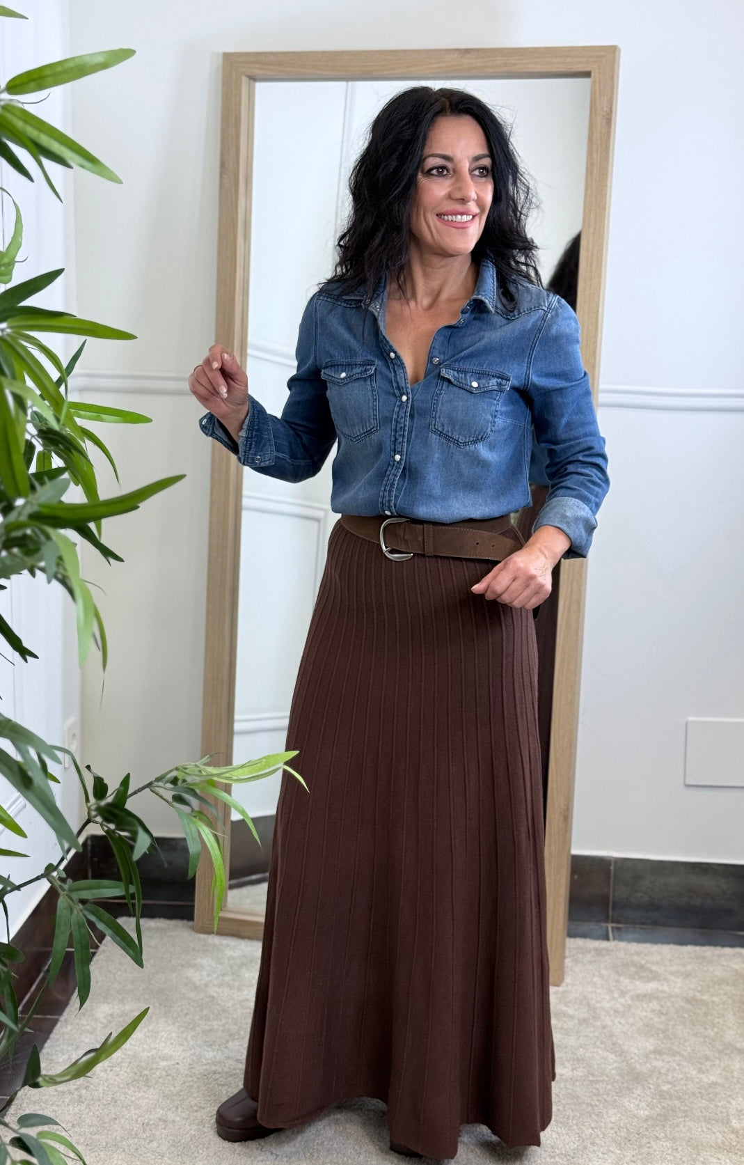 Falda punto midi chocolate con cintura elastica, es evasé.