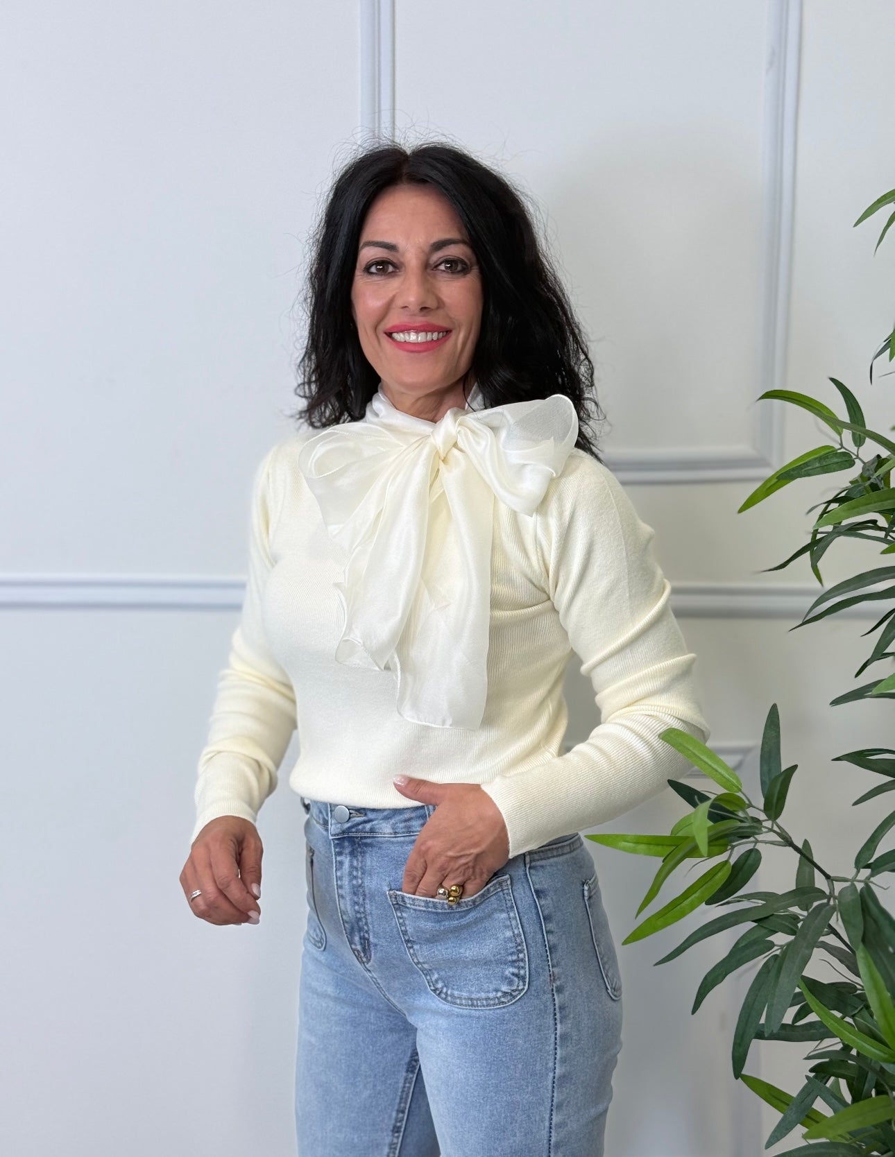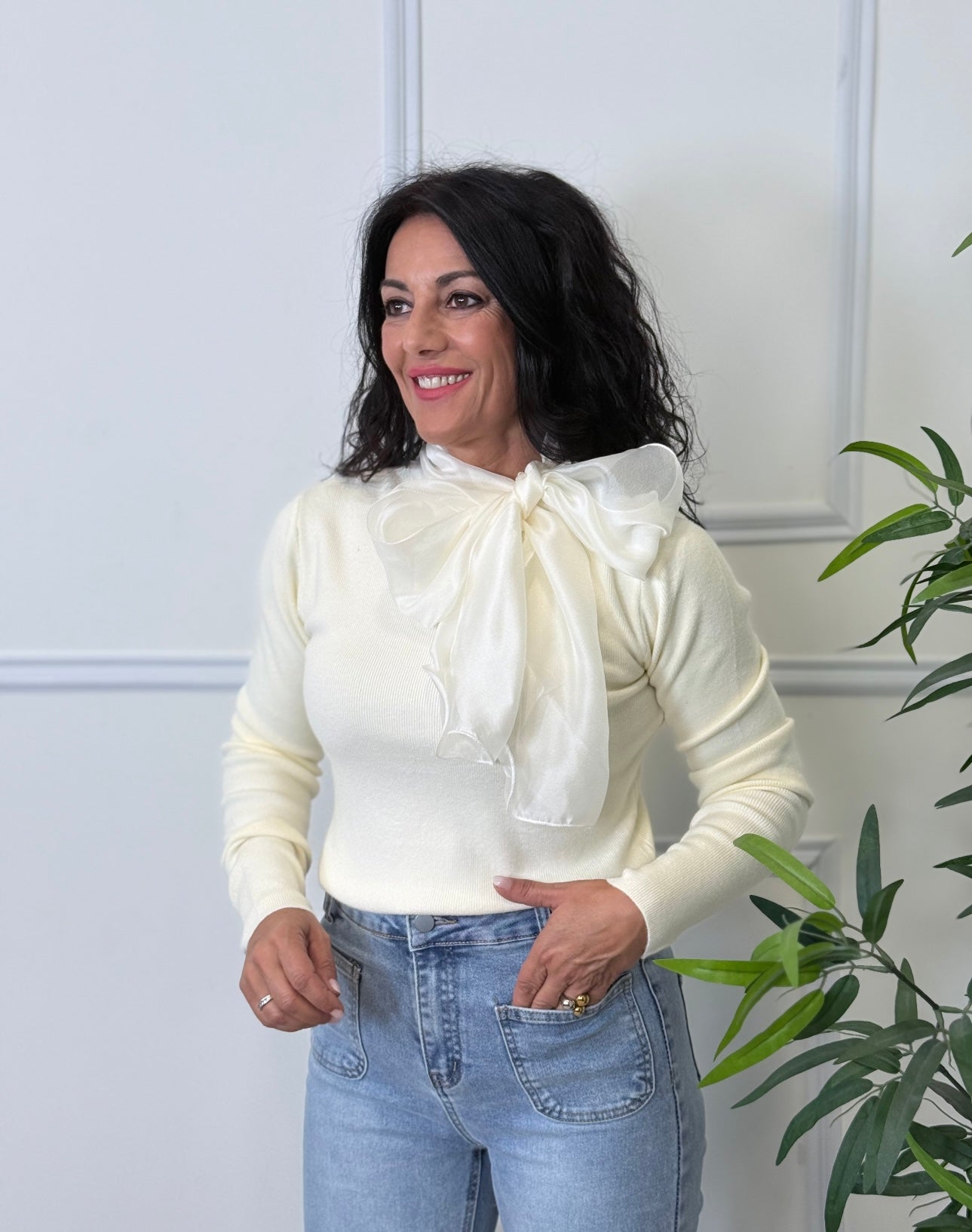 Jersey punto canale detalle cuello lazada, cuello redondo con cierre botón trasero, tacto suave.