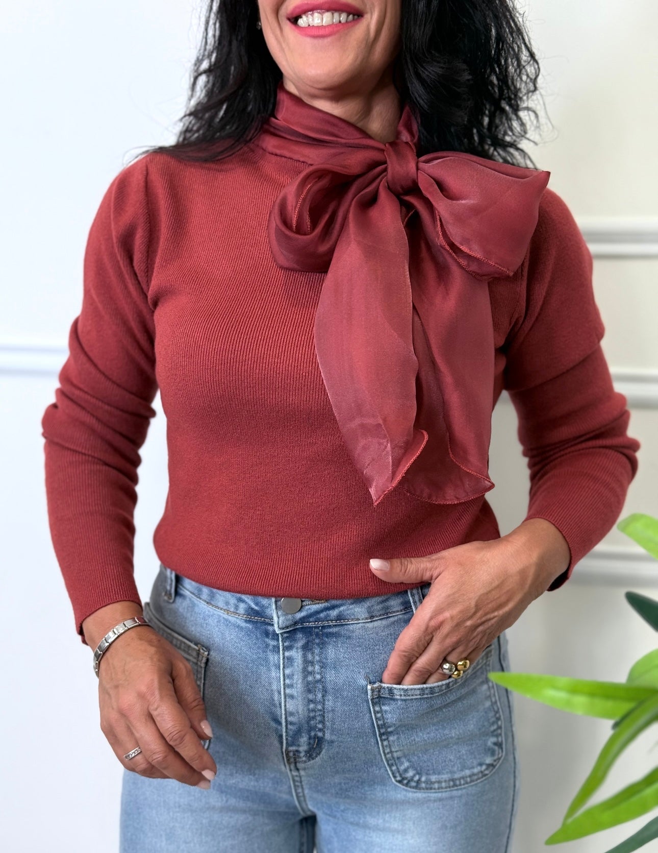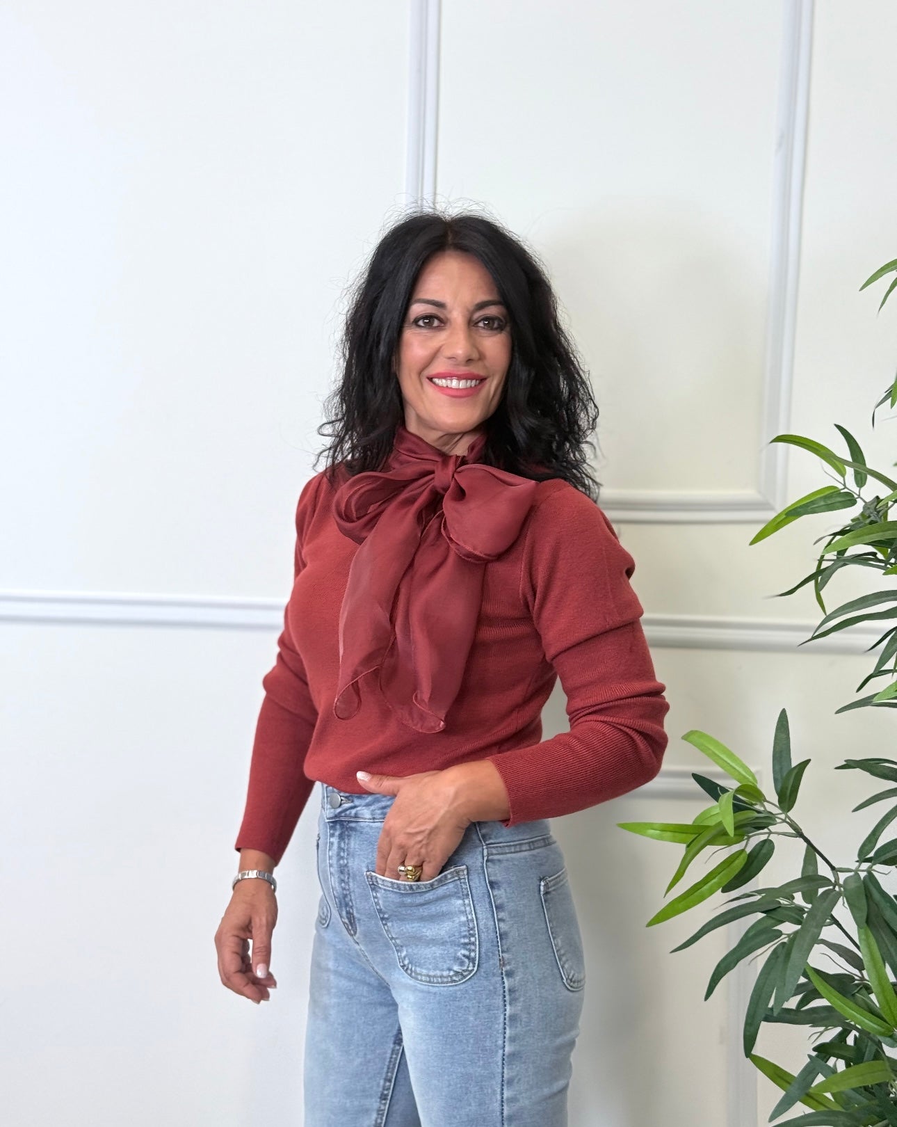 Jersey punto canale detalle cuello lazada, cuello redondo con cierre botón trasero, tacto suave.