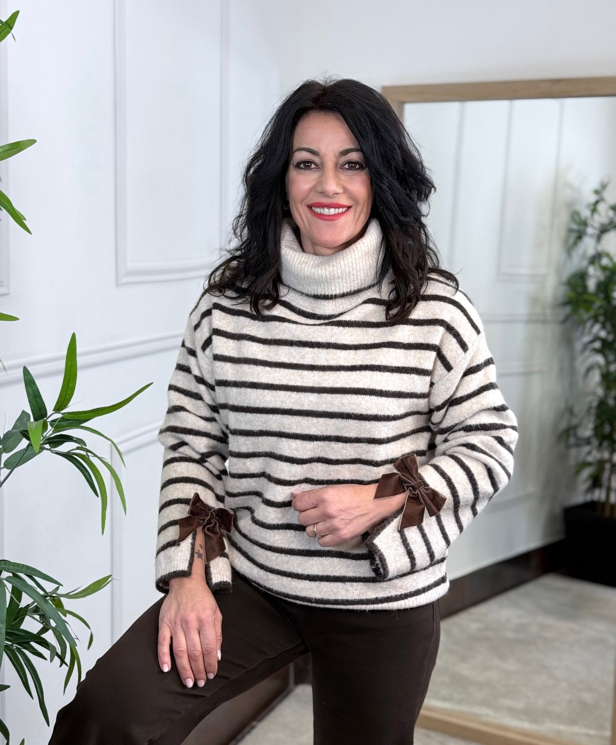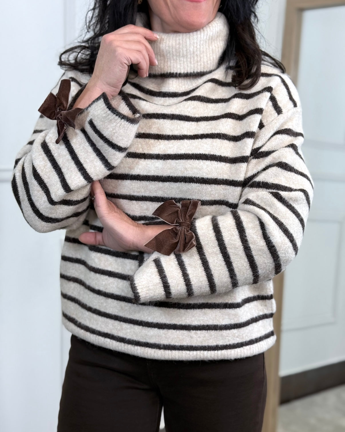 Jersey cuello subido en tono beige con rayas en chocolate, detalle en las mangas de lacito en terciopelo, chocolate