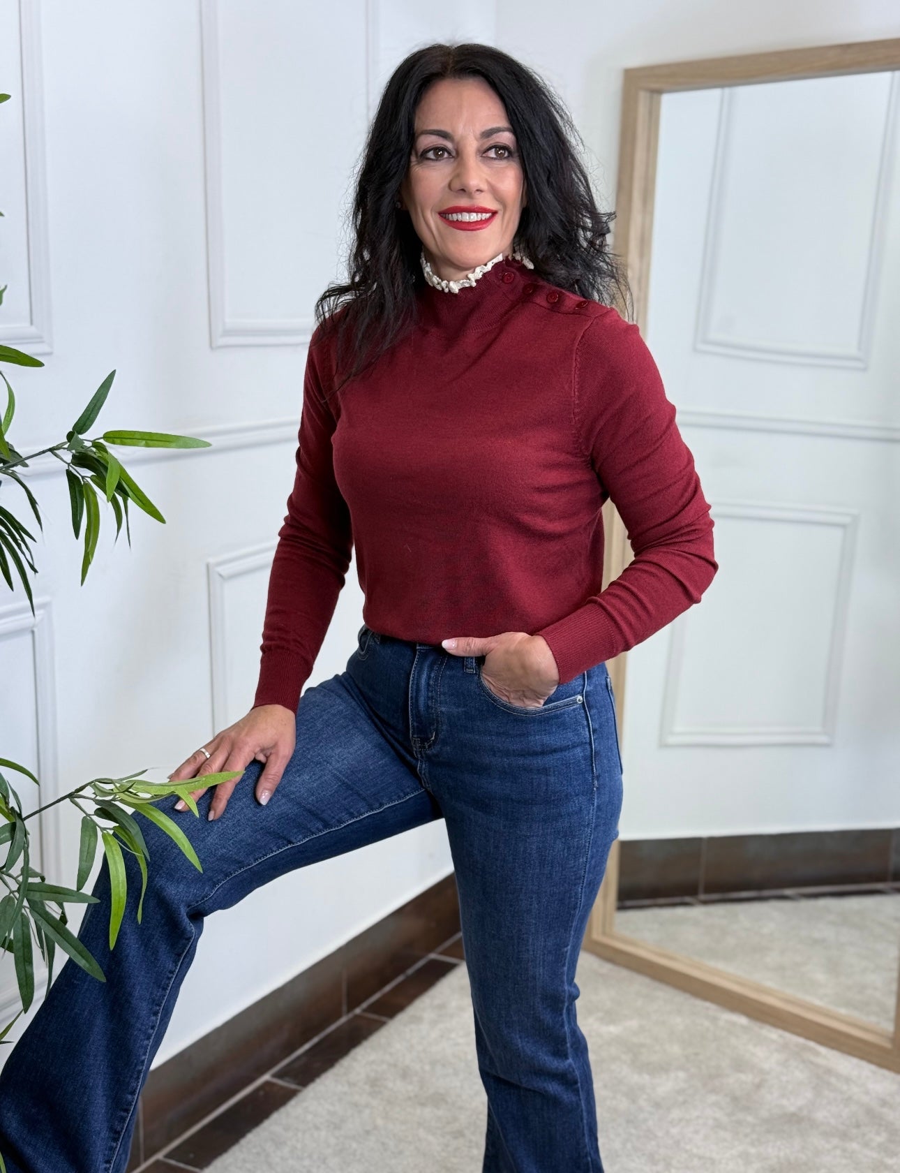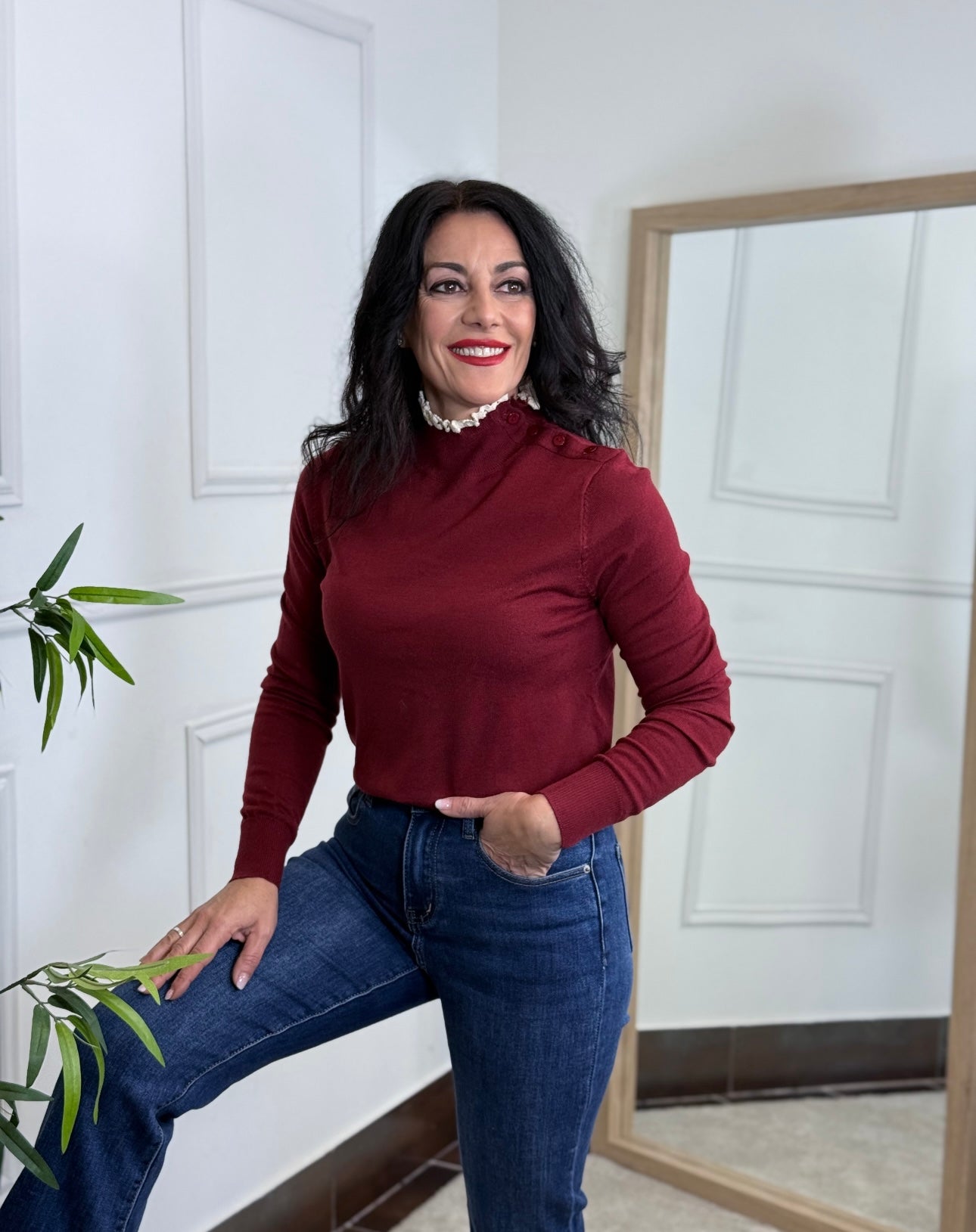 Jersey punto detalle botones en hombro, cuello perkins detalle puntilla beige, es elástico, puños y bajo elásticos.