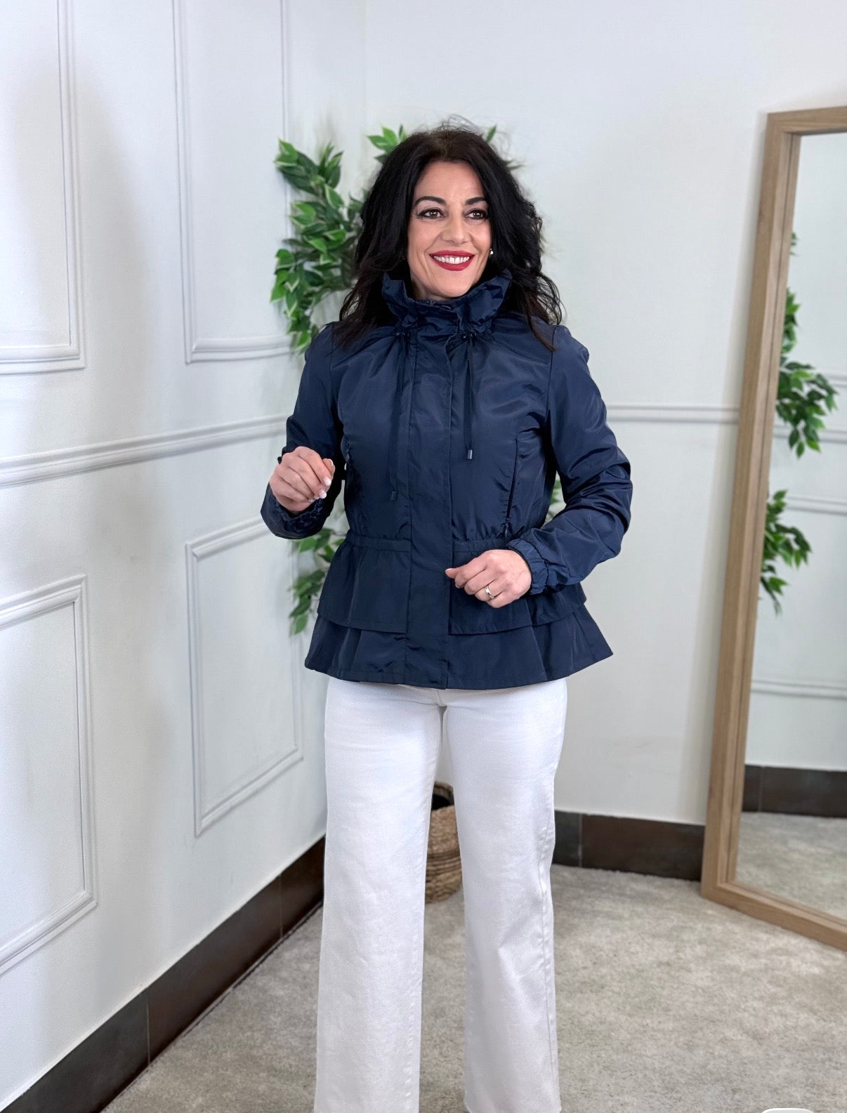 Parka impermeable con detalle de volantes. Corre con cremallera y botones. Puño enconado. Cintura ajustable.
