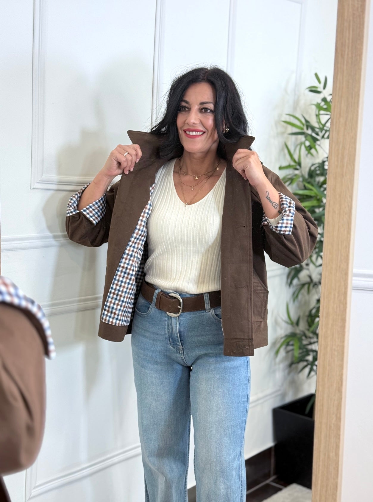 Chaqueta chocolate combinado forro interior vichy azul, chocolate y blanco, cierre con botones lateros, detalle en espalda hebilla, bolsillos delanteros, puños con botones.